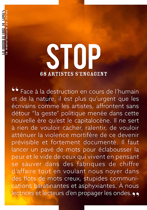 « Il y a des périodes de l’Histoire particulières où, comme l’affirme Sandra Lucbert : “La hauteur des enjeux, des urgences et même des périls nous requiert.” Il n’est pas inadmissible, pour un artiste, de continuer à travailler sur des questions non politiques. Mais il est parfois nécessaire de s’arrêter un temps, pour imaginer un autre futur, refonder une collectivité, une communauté basée sur l’interdépendance et le respect. Nous, les autrices et les auteurs, face à l’urgence, considérons que nous vivons une époque où la littérature est appelée à se positionner. »